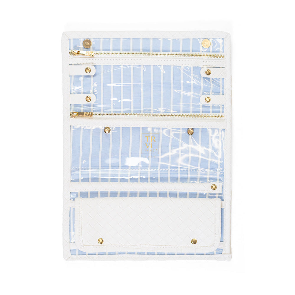 Our Luxe Woven Jewelry Wallet in Blanc is a chic refresh of a TRVL favorite, designed to keep your jewelry secure and organized wherever you go. With smart interior details and a coordinating pinstripe lining, it’s a polished essential that pairs beautifully with the entire TRVL collection.