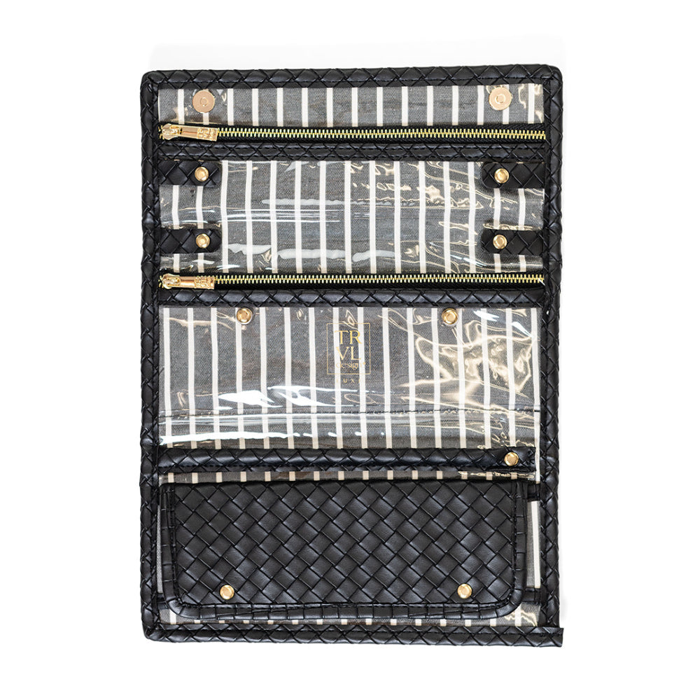 Our Luxe Woven Jewelry Wallet in Jet is a chic refresh of a TRVL favorite, designed to keep your jewelry secure and organized wherever you go. With smart interior details and a coordinating pinstripe lining, it’s a polished essential that pairs beautifully with the entire TRVL collection.