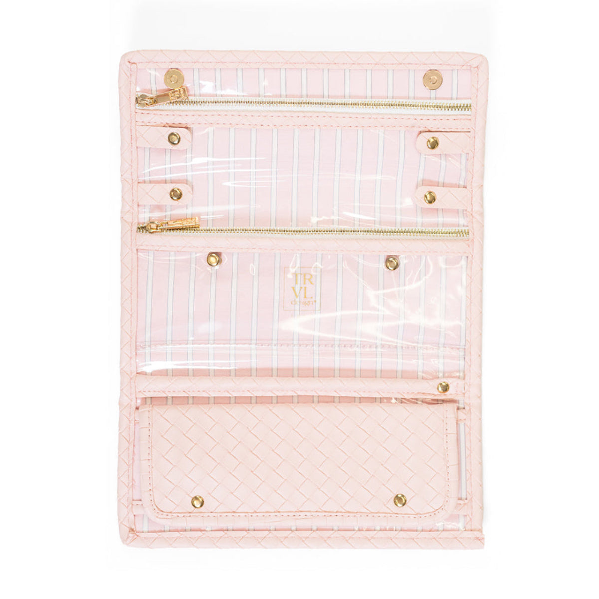 Our Luxe Woven Jewelry Wallet in Shell is a chic refresh of a TRVL favorite, designed to keep your jewelry secure and organized wherever you go. With smart interior details and a coordinating pinstripe lining, it’s a polished essential that pairs beautifully with the entire TRVL collection.