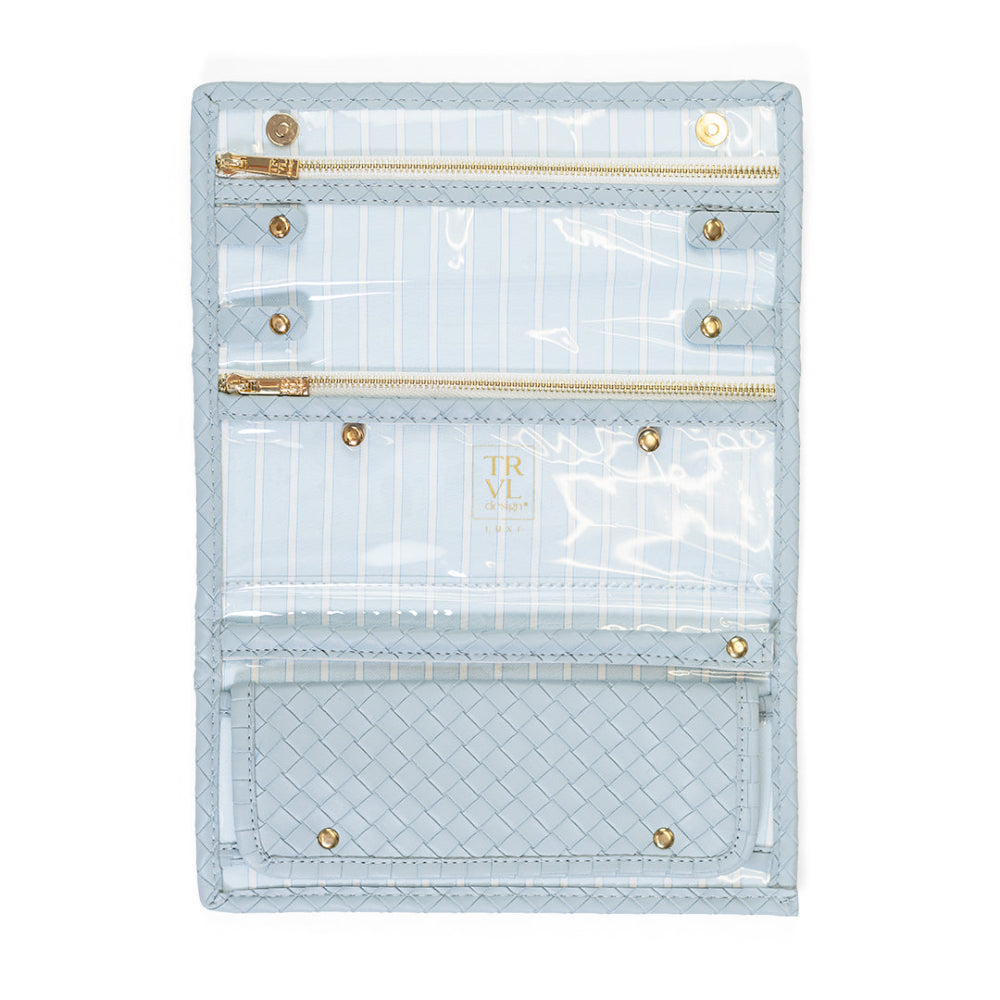 Our Luxe Woven Jewelry Wallet in Surf is a chic refresh of a TRVL favorite, designed to keep your jewelry secure and organized wherever you go. With smart interior details and a coordinating pinstripe lining, it’s a polished essential that pairs beautifully with the entire TRVL collection.