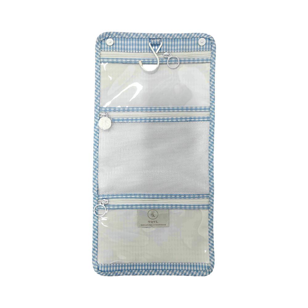 This cute Mini Rollup foldable hanging toiletry bag with ample pockets keep overnights and family trips organized! Features three interior pockets: 2 clear + 1 stretch mesh, snap closure, and a sturdy built-in hook that allows you to hang this bag anywhere.