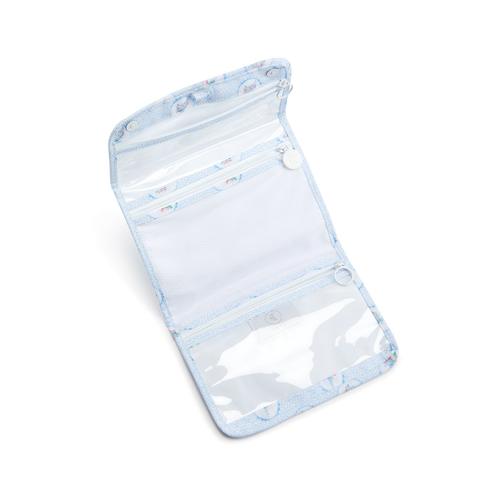 This cute Mini Rollup foldable hanging toiletry bag with ample pockets keep overnights and family trips organized while TRVLing! This hanging toiletry bag features three interior pockets, snap closure, and a sturdy built-in hook that allows you to hang this bag anywhere.