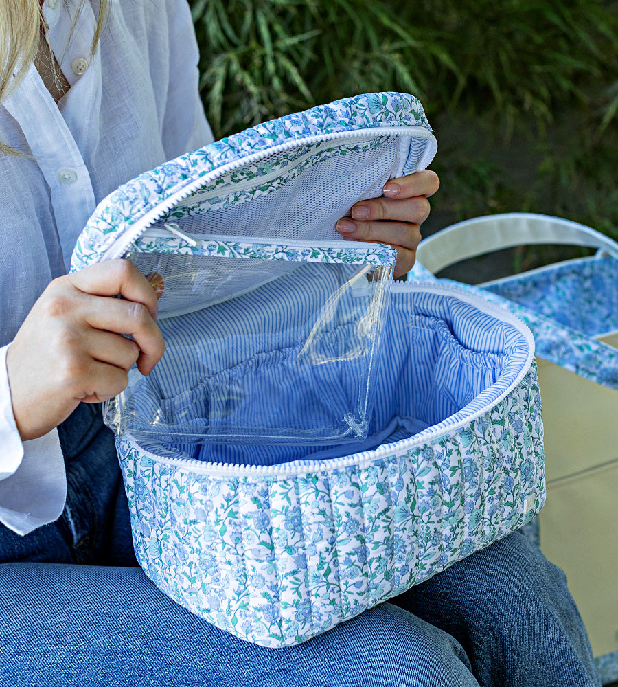 Our Quilted Train Set is super stylish and lightweight that will keep your cosmetics organized on the go. It opens up to offer ample room for makeup and beauty products, a zippered mesh pocket on the inside lid, elasticized compartments around the outer edge, and a removeable clear pouch. This set makes the perfect thoughtful gift for a lover of beauty and cosmetics or it can be an ideal treat for yourself when you're off on your travels.