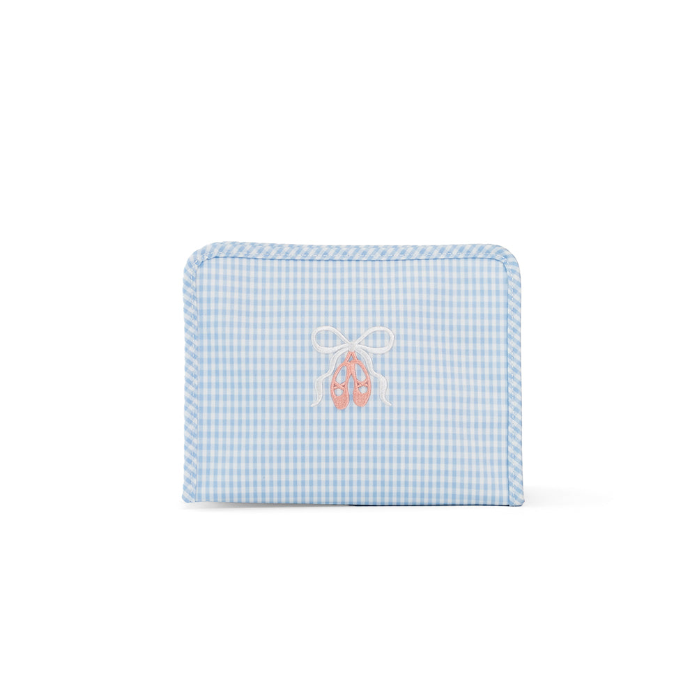 Our best-selling Roadies are our BFFs in the pouch world! Available in 3 sizes, our Large Roadie is made in a cotton gingham with a thin Eco-friendly matte coating, an inside slip pocket and exterior snap open zip tabs for a wider opening and an easier access.