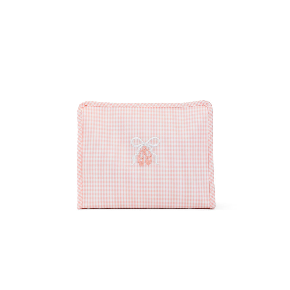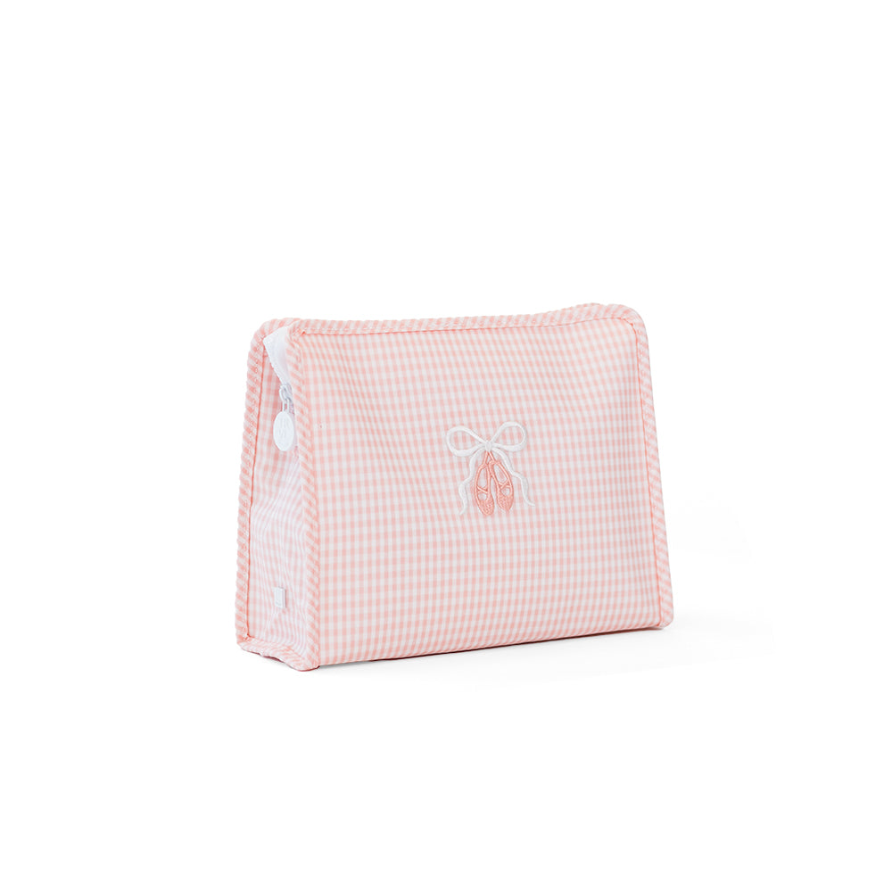 Our best-selling Roadies are our BFFs in the pouch world! Available in 3 sizes, our Large Roadie is made in a cotton gingham with a thin Eco-friendly matte coating, an inside slip pocket and exterior snap open zip tabs for a wider opening and an easier access.