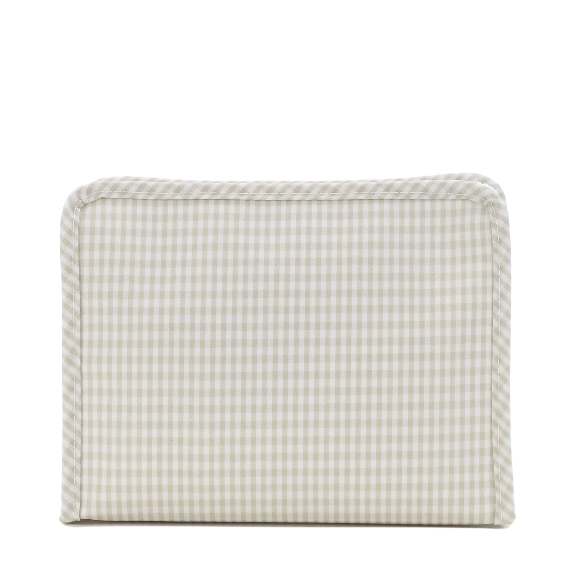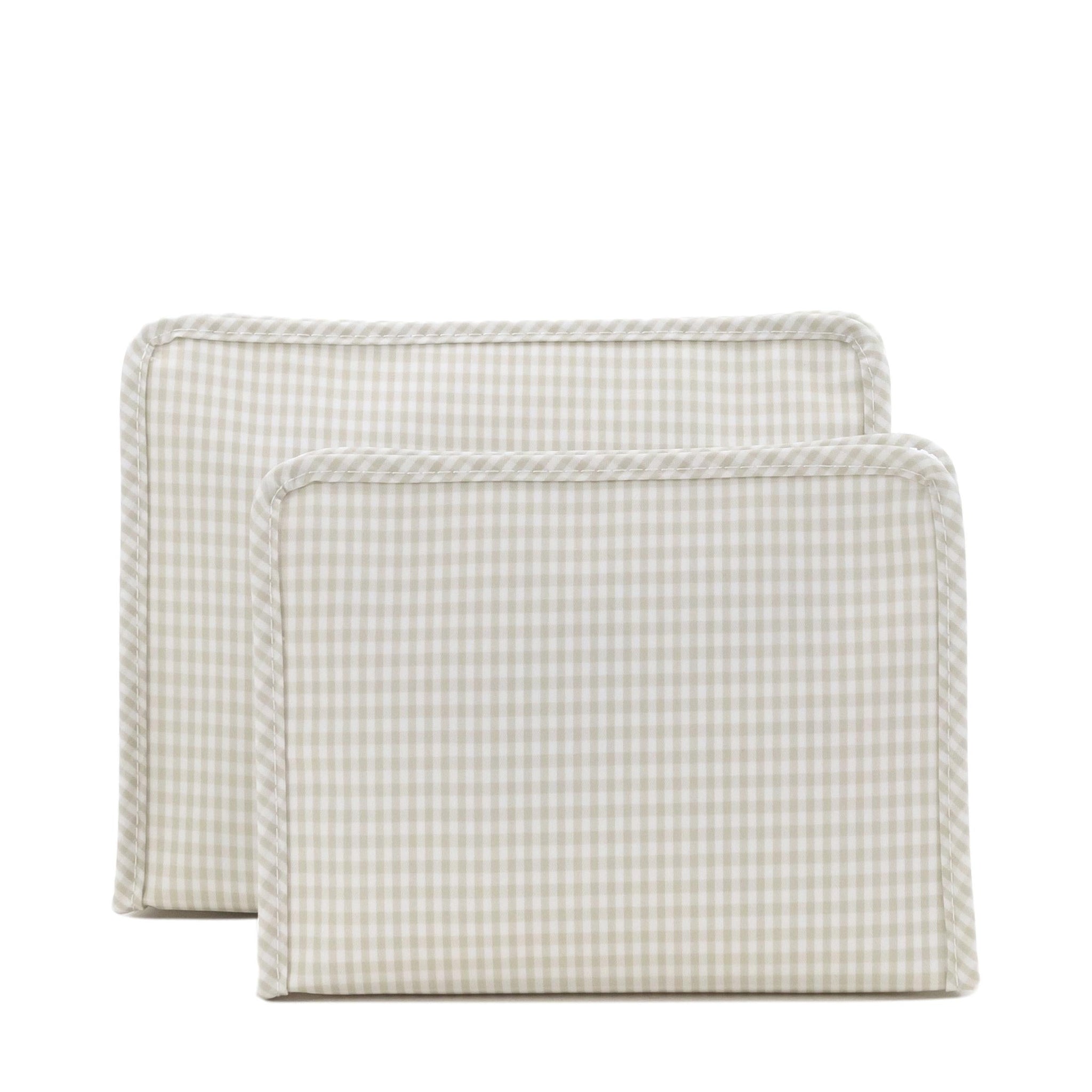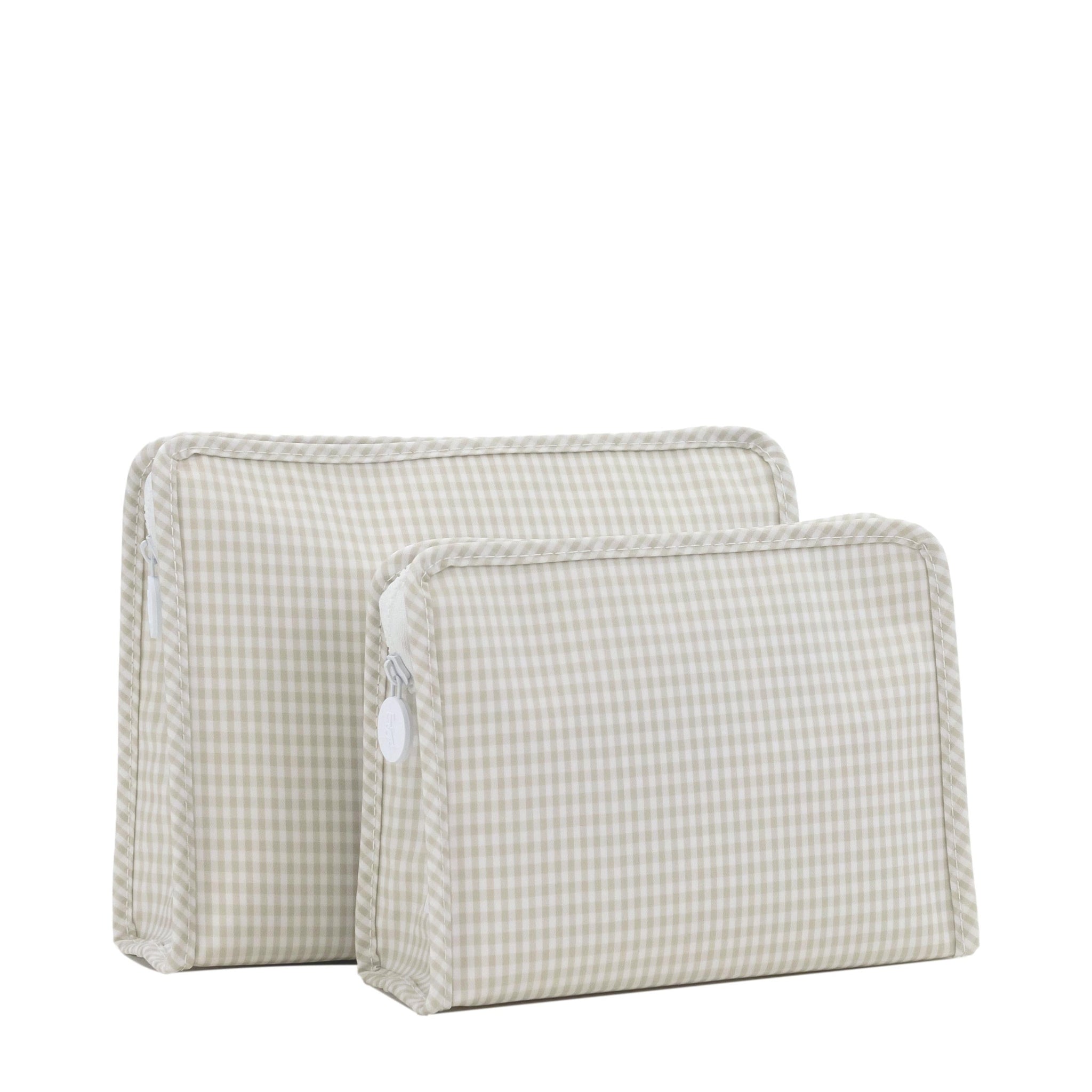 Our best-selling Roadies are our BFFs in the pouch world! Available in 3 sizes, our Medium Roadie is made in a cotton gingham with a thin Eco-friendly matte coating, an inside slip pocket and exterior snap open zip tabs for a wider opening and an easier access.
