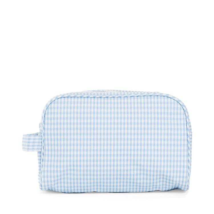 This soft yet sturdy toiletry bag is the perfect Stowaway at home or on the go! It's roomy size can store your grooming supplies, make-up, hair care, plus holds a supply of diapers and wipes. Styled with a chunky top zip, wide gusset and side handle plus a roomy interior and wall pocket - the gingham exterior is coated and interior is wipeable and this bag is machine washable!