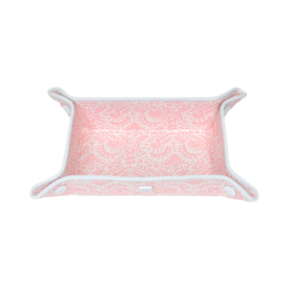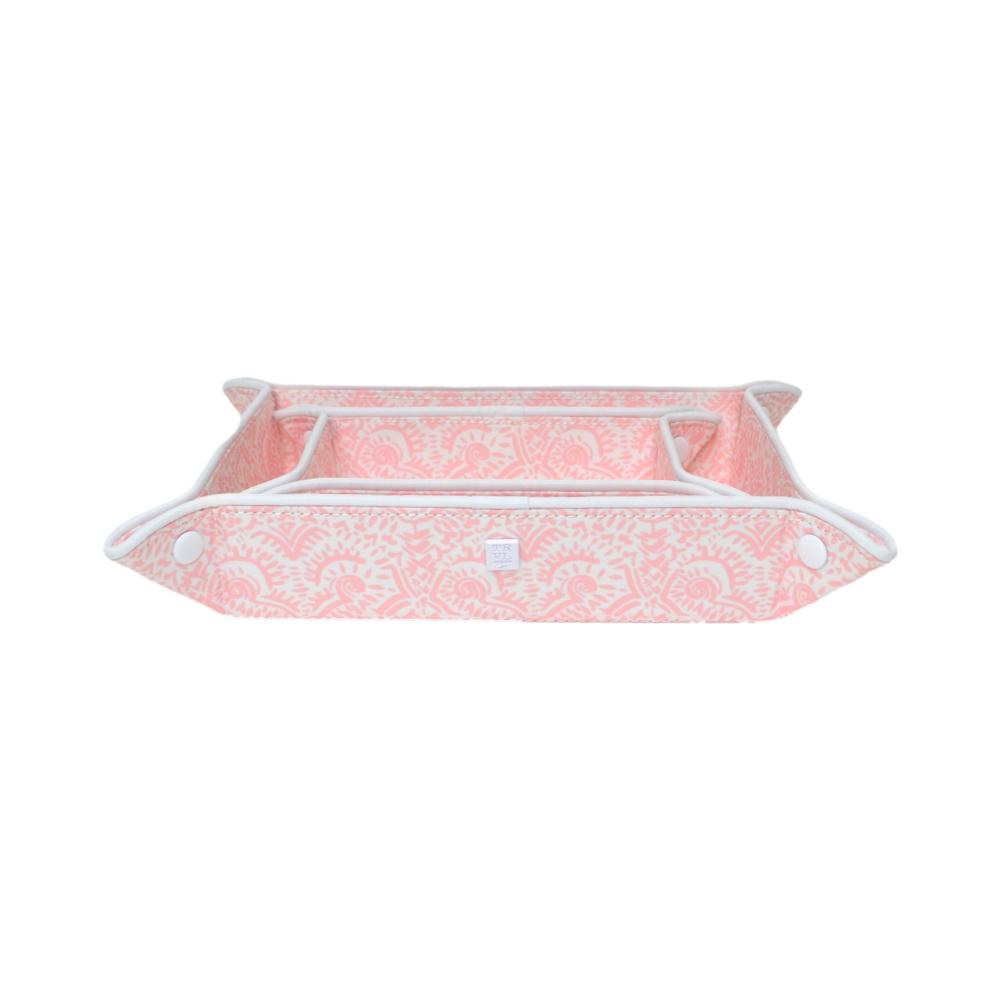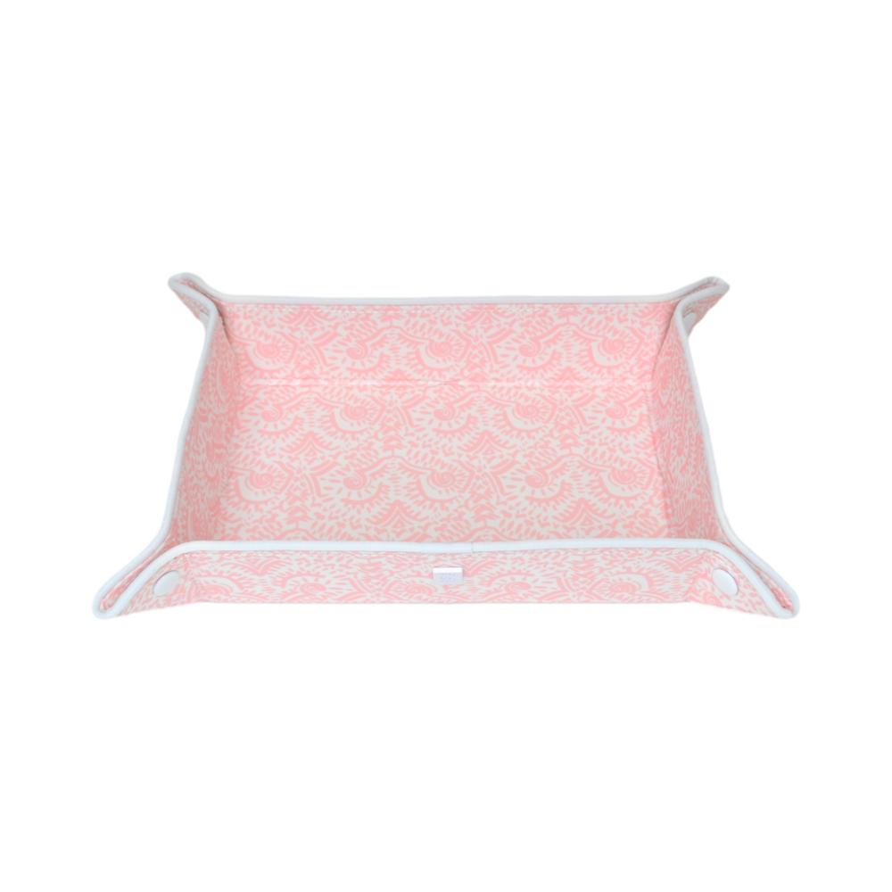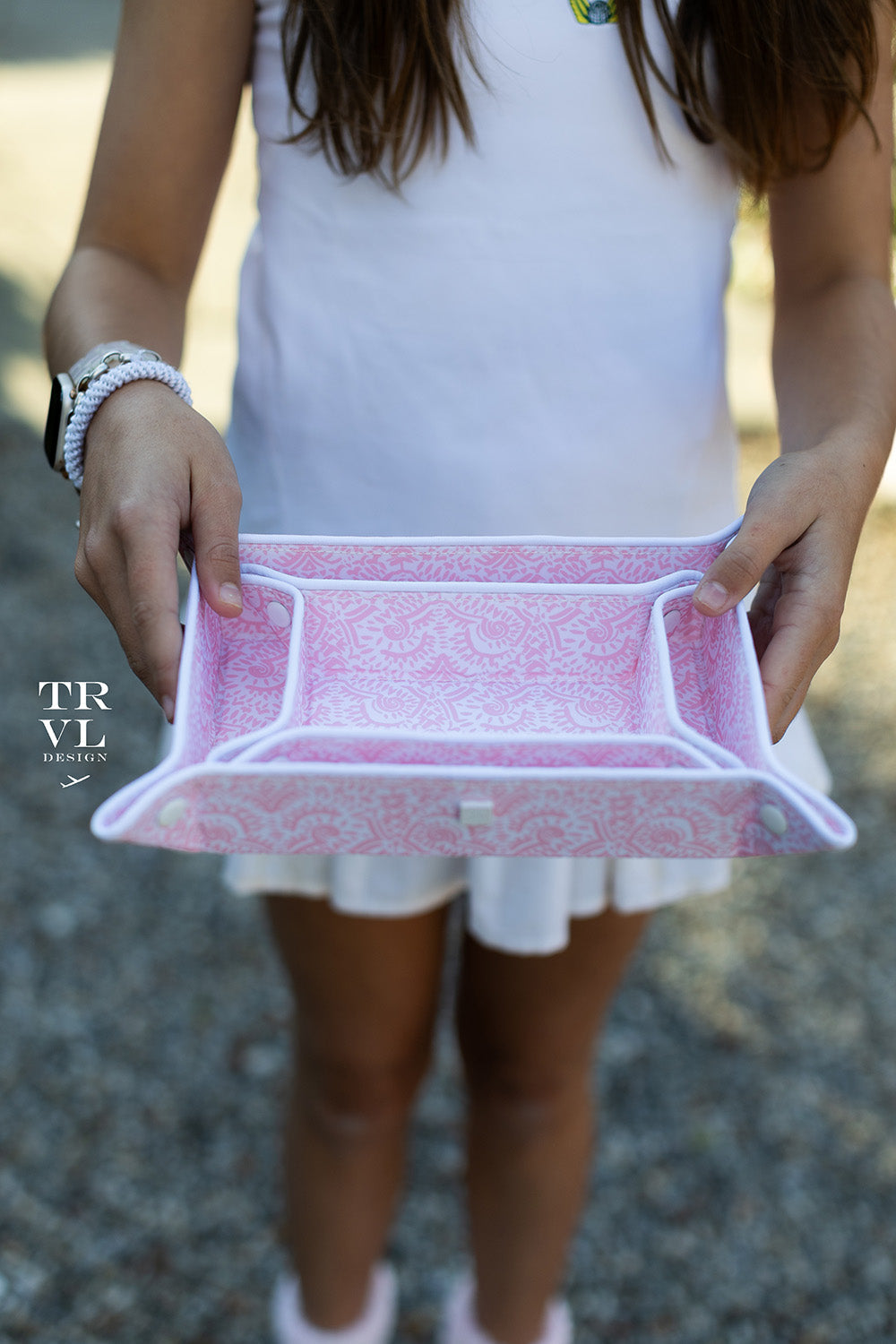 Stay organized with our Tray Set, designed to catch all your pocket-sized items for home, office or TRVL. Designed in our batik print, the four corners can be unsnapped to easily fit in luggage and placed on a hotel nightstand, to ensure no valuables are left behind. Makes for a great gift!